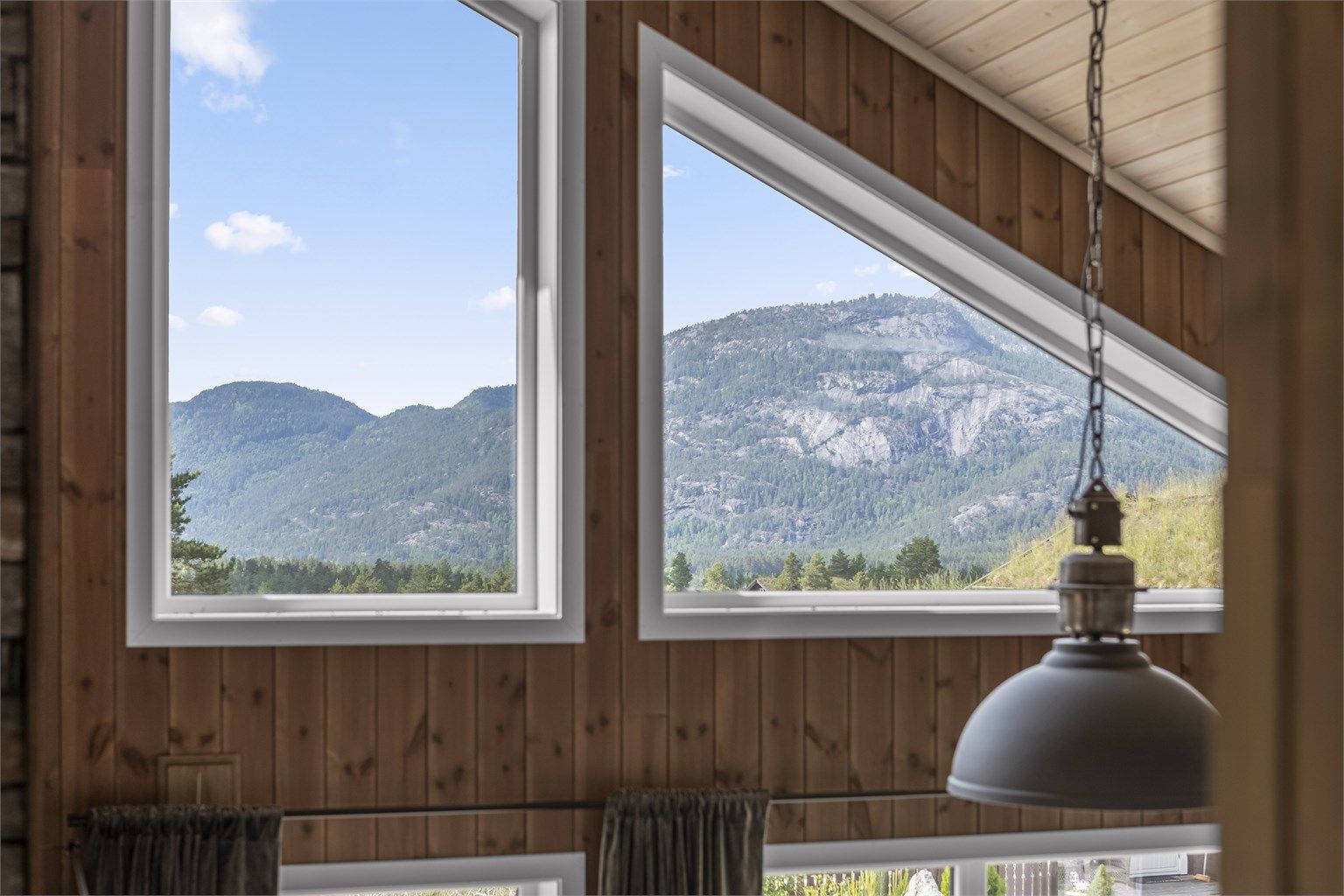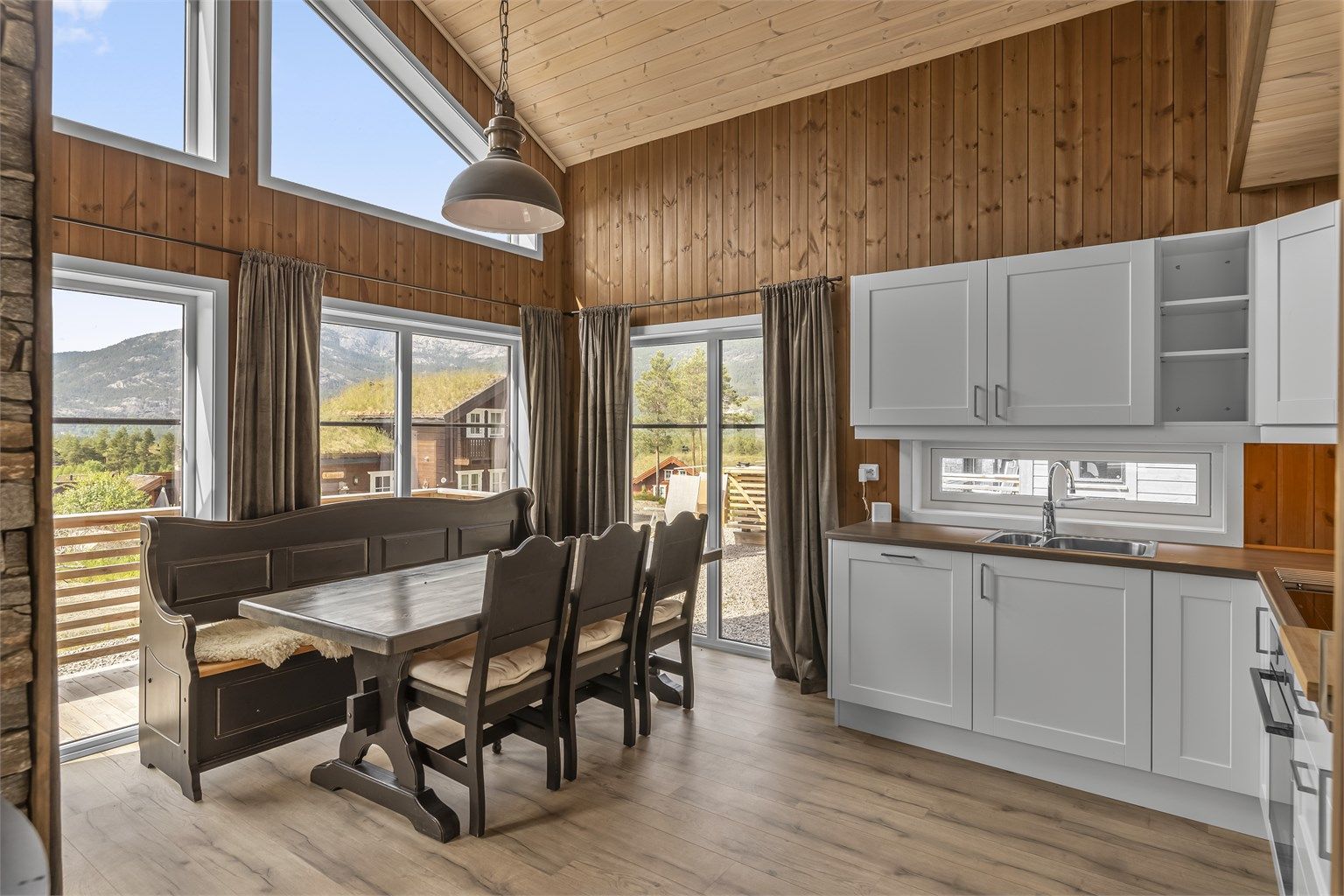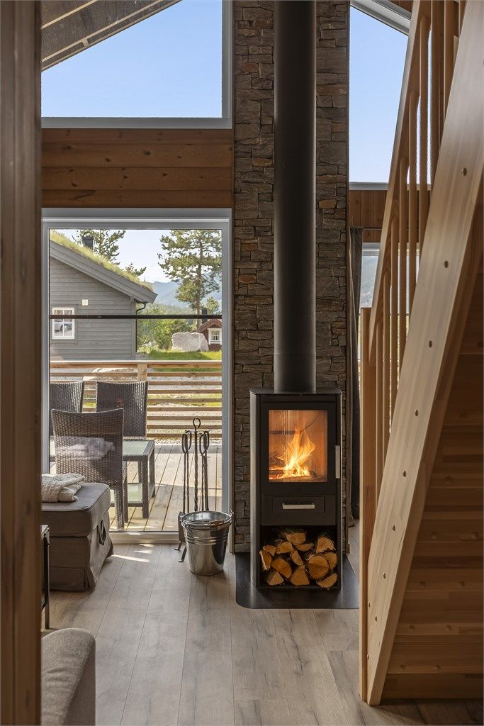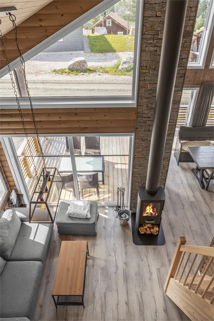 • Lys og moderne hytte med åpen himling og store vinduer som gir godt naturlig lys til oppholdsrommene