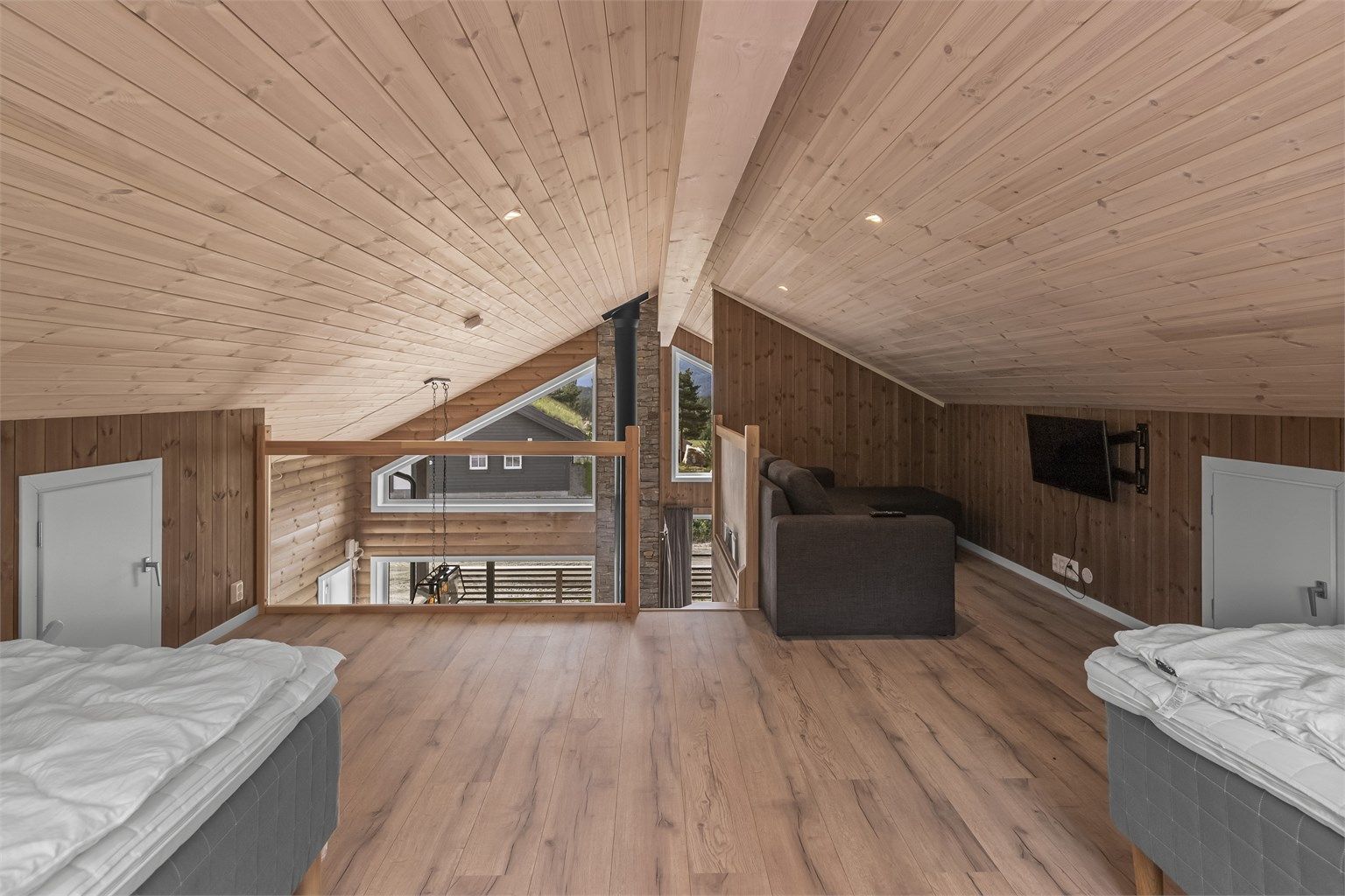 I stuen er det trapp opp til hemsen, som har glassfasade/rekkverk mot stuen og de store vindusflatene, slik at lyset slipper til også her. Det er på hemsen innredet med to dobbelsenger, men det er ikke godkjent til soverom/varig opphold pga rømning og lav takhøyde. Dog et praktisk rom til for eksempel ungdommen å kunne trekke seg tilbake.
