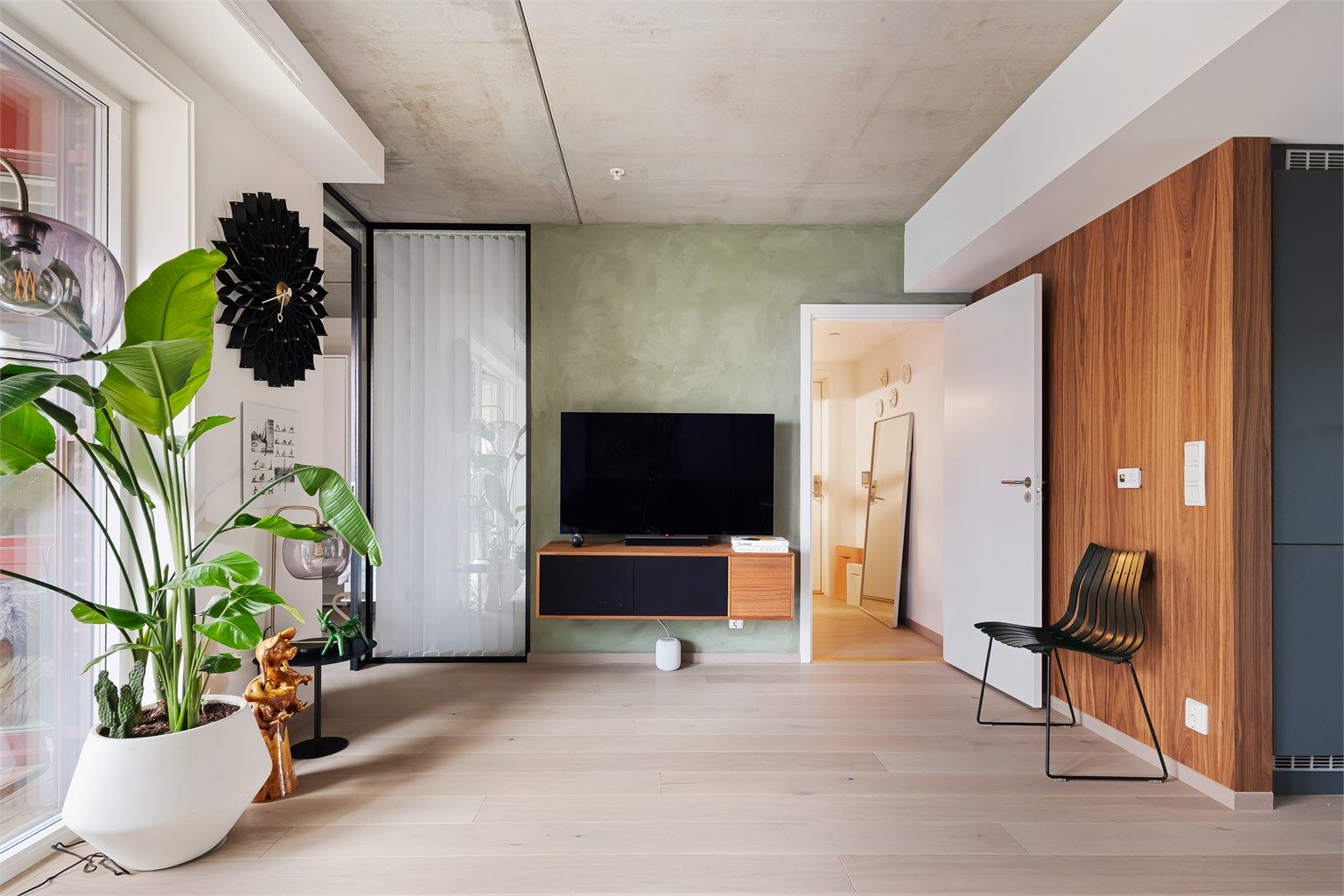 Velkommen inn! Leilighetens entré er lys og innbydende og gir et svært godt førsteinntrykk av boligen. Her er det god plass til å henge fra seg yttertøyet og sette fra seg sko.