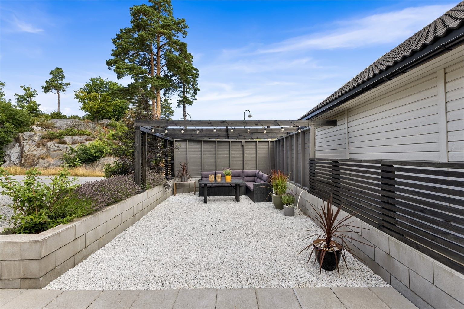 Tomten er pent opparbeidet med lekre beplantninger og har flere uteplasser med solrike soner. Dobbelgarasje med innredet loft og romslig gårdsplass gir rikelig med parkeringsmuligheter.