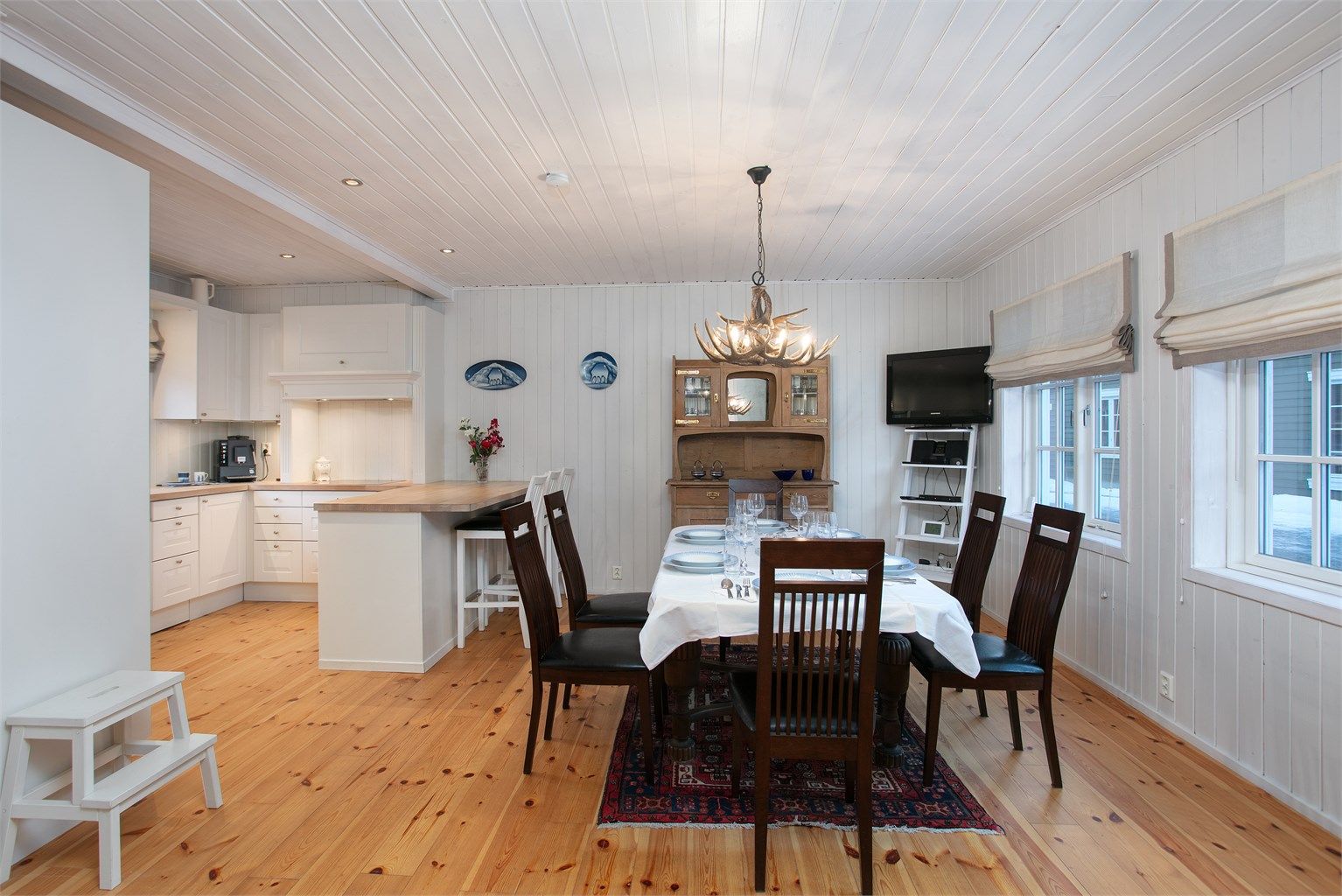 Det er åpen løsning mellom stue og kjøkken med god plass til romslig spisestue. Flott peis med glassdør som gir en lun og hyggelig atmosfære. På gulv er det lagt furugulv med gulvvarme, vegger og tak i malt panel.