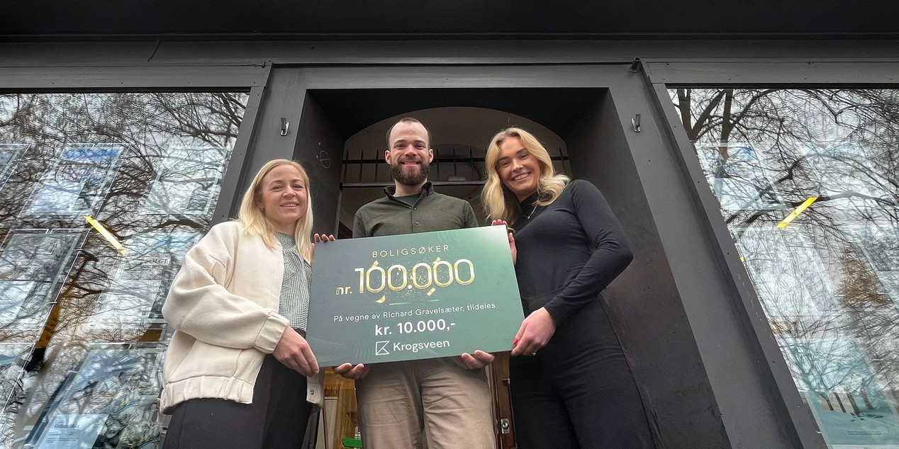Den heldige kunden som ble boligsøker nr 100.000 var Richard Gravelsæter fra Arendal. Han både bor og leter etter sin første leilighet i Oslo. Etter å ha blitt fulgt opp av megler Michelle Hellevik på vårt Grünerløkka-kontor, ble Richard registrert som boligsøker. Richard forteller at han syntes det var smart å ligge litt i forkant av markedet med å få tilsendt passende boliger som kommer for salg, og at han satte pris på å bli fulgt opp av Michelle. At han i tillegg fikk et godt tilpasset boligsøk opplevde han som verdifullt. Det ble litt av et lykketreff; han ble registrert som boligsøker nr 100.000 og fikk dermed overlevert verdisjekken av Karin.