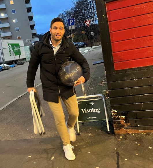 Vi gir ham et par timer for seg selv, før vi igjen møter ham med visningsskiltet under armen. Han har kommet seg igjennom Oslo-gatene fra Majorstua til Sofienberg.